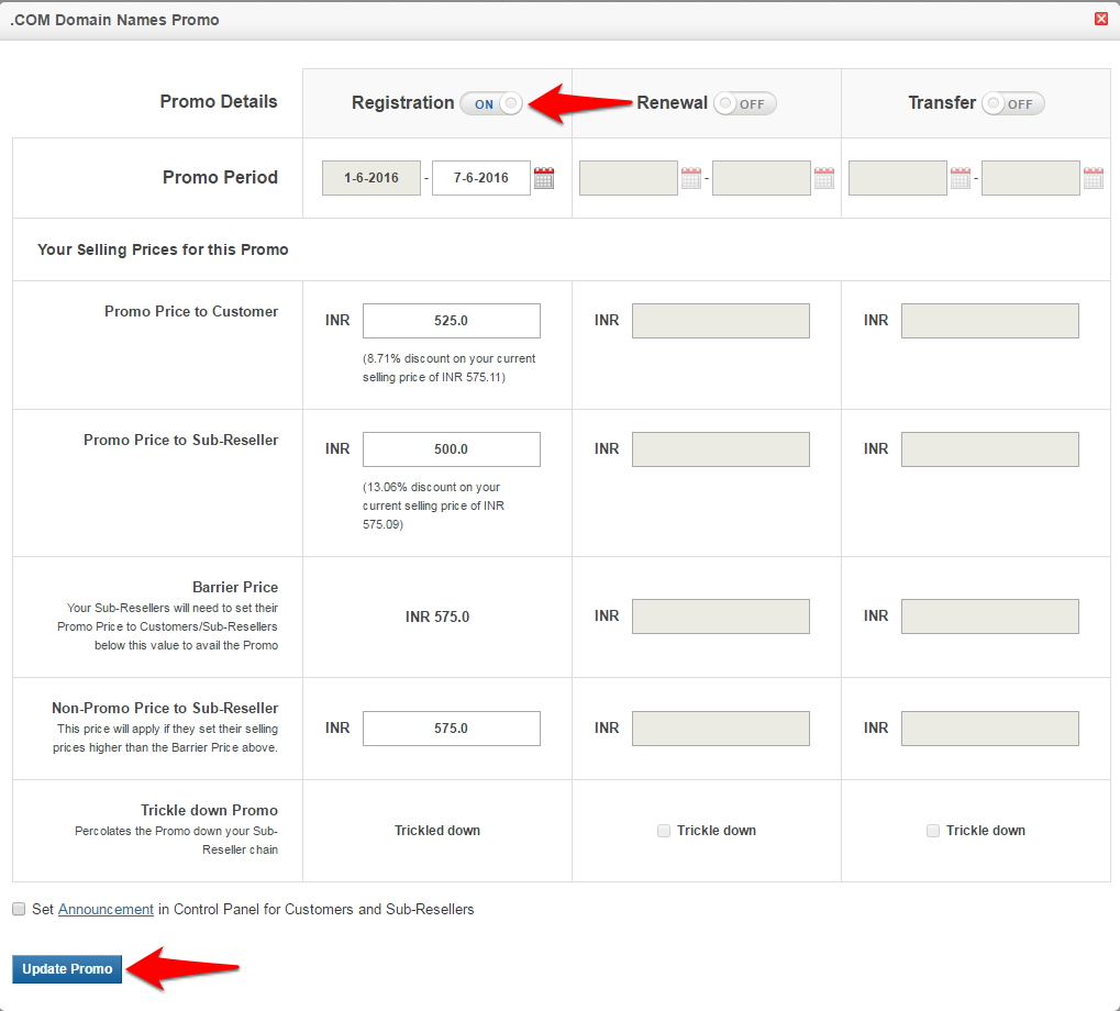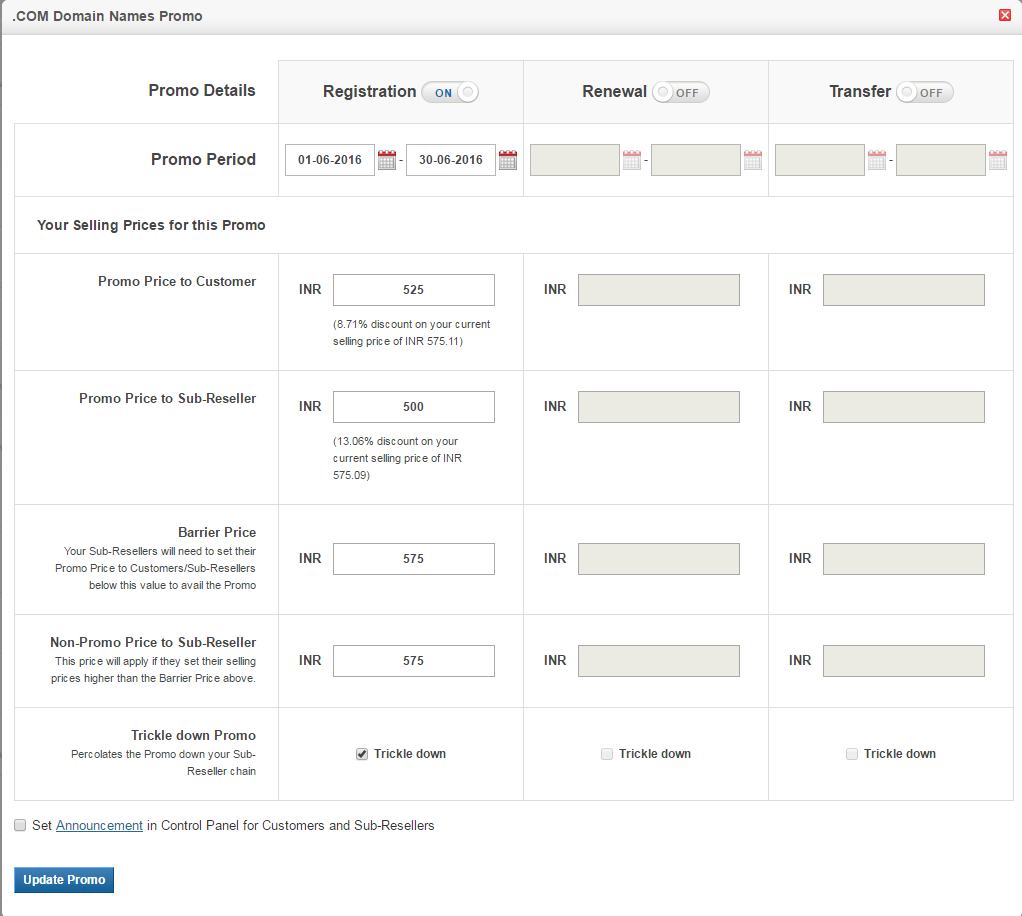 - Promo Price to Sub-Reseller: This field contains the pricing that applies to those Sub-Resellers under you, who further pass on the benefits of the Promo to their Customers and Sub-Resellers. To achieve this, your Sub-Resellers need to set their Customer and Sub-Reseller Pricing to lower than the barrier price set by ResellerClub - China.