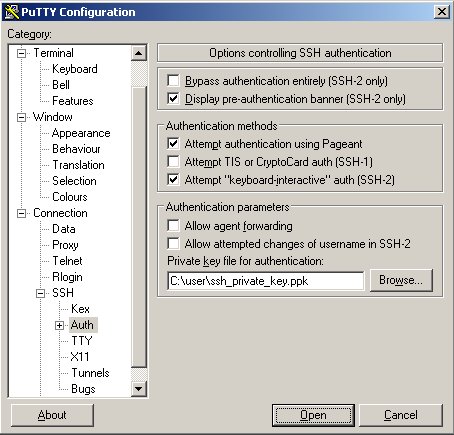 In the left menu, click Auth under Connection -> SSH and enter the path of the saved private key file.