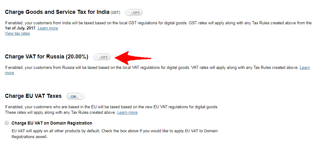 Click on the ON / OFF toggle next to Charge VAT for Russia.
